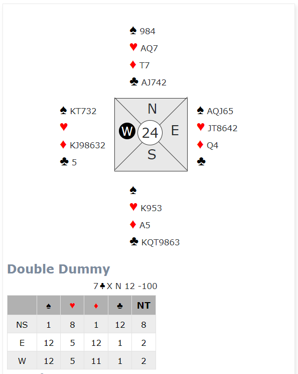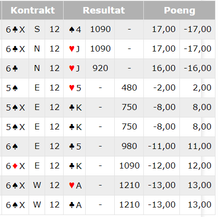 Syd hadde sp 43- hj 10- ru K109864- kl AD62 og kontrakten ble dermed vunnet. I det andre rommet valgte Jan Mikkelsen mot samme kontrakt å spille ut ruter og dermed hadde Øst lett spill for 12 stikk.