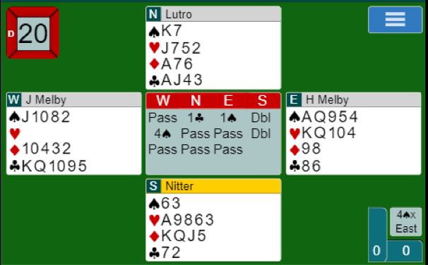 Som tenkt så gjort tok spillefører to runder trumf (2-2 sits). Så spilte han tre runder hjerter og kastet en spar. I hjerter fulgte syd med liten, så tieren før han kastet en ruter. Så den fargen ga altså ikke fire stikk. Nå ville han forsøke å godspille sparstikk ved å stjele en spar. Men da han to for esset og liten til kongen viste det seg at sparen satt 5-1. Siste sjanse måtte forsøkes - rutefinessen. Dessverre hadde nord ruter konge - en bet.