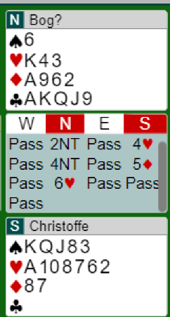 Min venn gikk altså en bet, og da Kina spilte 6NT med tretten stikk ved det andre bordet kostet spillet 17 IMP for NZ. Hvis 7 kløver hadde blitt vunnet ville det blitt 12 IMP andre veien - 29 IMP i sving. I kampen betød det fra under 2VP til et knepent tap for sølvvinnerne, og den dobbelsvingen utgjorde forskjellen fra første til andreplass i mesterskapet.