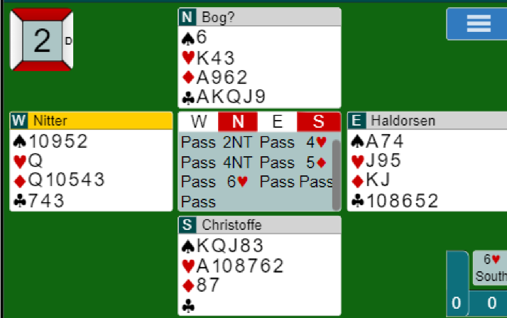Det er nokså hardt meldt med storeslem, men en bra kontrakt. En ser jo umiddelbart at en spar kan kastes på hjerter, og ruterfinessen kan gå. Den finessen gir 50% sjanse i se selv, men det er andre muligheter. Og spesielt siden trumfen viser seg å sitte 2-2 kan en få testet et par ting her.