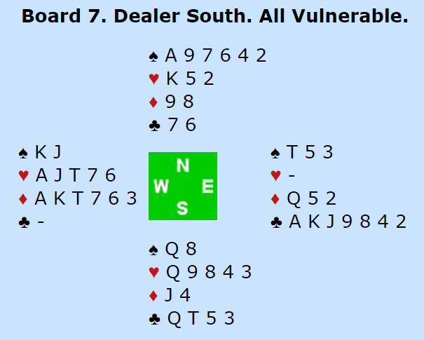 4 ruter var altså ment som cue- bid og han viste med 6 hjerter at han hadde 4-6 i majorfargene. Godt meldt, men med kl J ut fra Øst skulle Gjøs spille hjem 12 stikk, minst. Hva ville du satset på? Utspillet gikk til kl D og Gjøs satset på at 13 stikk kanskje kunne vinnes. Derfor dro han ru A fulgt av ru K men da jeg i Vest på siste la ru D ble han betenkt, men satset likevel på at jeg hadde minst 3-kort ruter. Ru 3 til9 hos Marthinussen, røff i bordet og ru 10 hos meg ga info nok. Inn på hj A og en 4. ruter det Nord var utsolgt godspilte ru 5 i bordetsiden Vest hadde hatt ru DJ103 fra start. På hj K og hj Doppstom ingen vansker og de siste stikkene ble tatt av ru K5 med avkast av sp 9 8. 13 stikk og topp!