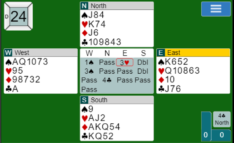 Spill med Terje Solli på NBFBuskerud (Trivselbridge) hver morgen med 14 spill og RealBridge kl 10. I spill 13 hadde jeg i 4. hånd og alle i faresonen en »giganthånd» etter som makker etter pass fra Øst åpnet med 3 hjerter og Syd passet. Min hånd.