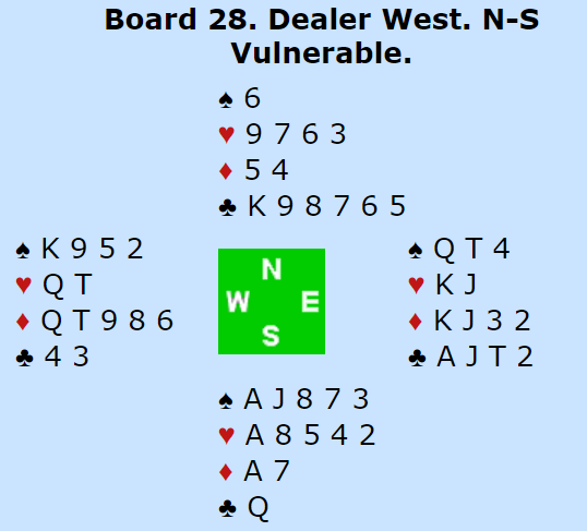 Nei, slemmen ble vunnet. Men det var fordi vest gjorde en ganske grov feil idet liten kløver ble spilt fra syd, han la i kløver 10! Esset vant, så kløver mot syd, og knekten kom på, syd stakk over med damen og vest med kongen. Nå sto kløver 9 og kunne ta ut vest sin siste kløver.