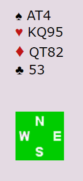 Mot syd sin 6 kløver kom spar knekt i utspill. Som du ser er kløveren slik at den kan løses med åtteren (eller nieren) fra nord og liten fra syd om øst følger med toeren. Vest vil i så fall vinne med tieren, og i neste runde rulles fargen opp med damen fra syd!