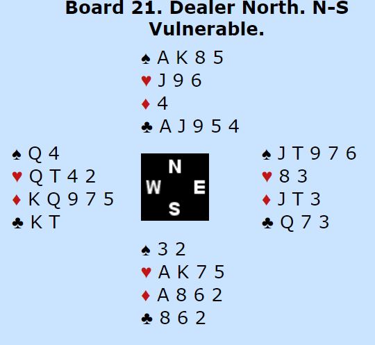 Dette er et læreboksspill. Hvis ruter sitter 4-4 spiller det ikke så mye rolle hva spillefører gjør i ruterfargen, men sitter utspillsfargen 5-3 må spillefører forsøke å kutte forbindelsen mellom øst og vest i fargen. Ruteren må lasjeres to ganger, og håpet er at den som kommer inn (øst i dette tilfellet) har kun tre ruter. Da kan det å bra selv om det må avgis to kløverstikk. Og kløverfargen er fargen spillefører må sette sin lit til.