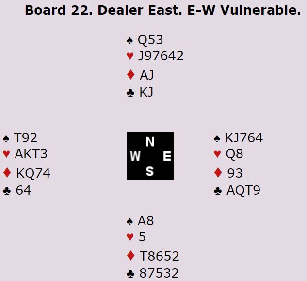 Syd spilte ved de fleste bordene ut sin single hjerter. Mange vant hjerterutspillet med damen og spilte ruter til kongen og esset. Derfra kom hjerter til stjeling, Nå er spillefører i trøbbel og fikk vanskeligheter med å både få tatt kløverfinessen som for så vidt løser den fargen enkelt, og i tillegg tatt to sparfinesser. Slik det gikk var det mange som gikk en bet, og noen gikk to bet i denne normale utgangen.