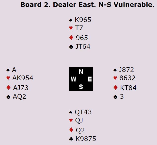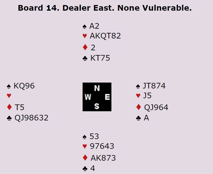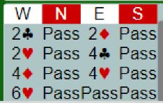Marianne Harding (syd) åpnet med 2 spar, femkorts farge pluss en minorfarge og 3-10 poeng. Vest passet og Ann Karin Fuglestad klinket til med 4 spar direkte med nrods kort. Øst sa 4NT, to steder å spille. Vest valgte da å si 5 ruter som øst korrigerte til 5 hjerter og viste dermed ruter og hjerter. Nå løftet vest til 6 hjerter, en tvilsom avgjørelse etter min mening. En bør i slike situasjoner ta litt høyde for at makkeren har strukket seg for at de ikke skal bli utmeldt. Men poenget er at de ikke vet sikkert, N/S har tatt bort alle muligheter for å undersøke.