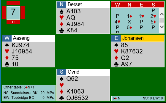 Det jeg har sett så langt i finalen er bunnsolid bridge fra lederlaget. Dessuten har de hatt en bra flyt. Her er et eksempel fra kampen mot Topbridge i den halvkampen som ble spilt fredag kveld.