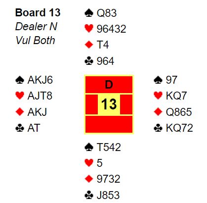 De tre andre bordene i semifinalen spilte (selvsagt?) 7NT, og laget til han med det lekre meldingsforløpet måtte tåle tapt spill med uvanlige 20 IMP (-2220 og -100).