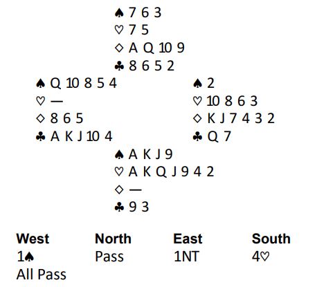 Vests sparåpning viste minst femkorts farge. Etter at begge motspillerne hadde meldt avsluttet syd meldingsforløpet med 4 hjerter. Der kan du ta over. Planlegg spillet etter at vest har spilt ut A-K i kløver, damen kom på fra øst i andre stikk, og så kommer en tredje runde kløver fra vest mens øst kaster en ruter. En opplysning til, i første trumfrunde kaster vest en ruter. Så du vet øst startet med tieren fjerde i trumf.