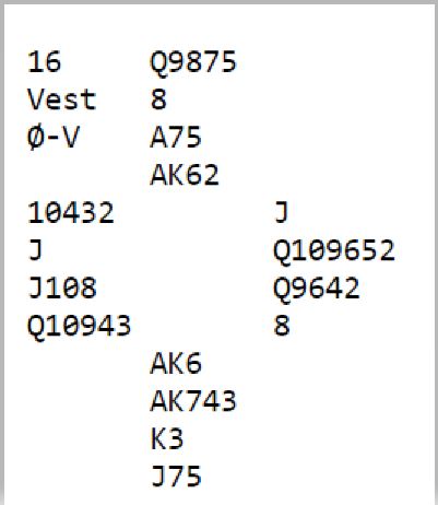 I åpen klasse stiller altså syv lag, ett lag har oversitt i hver runde. I det spillet du får presentert her ble det ved de seks bordene seks forskjellige resultater, i seks forskjellige kontrakter!