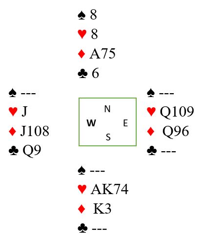I 7 hjerter går det bra selv med 4-0 sitsen i trumf fordi syd har knekten fjerde. Etter å ha lagt ned en honnør oppdages sitsen, og øst spilles inn fulgt av hjerterfinesse. Det blir tretten stikk i 7 NT på samme måte.