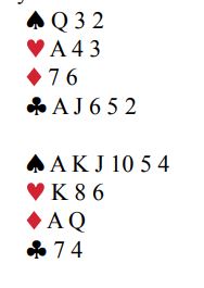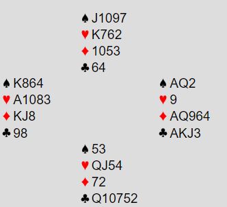 gikk som med kjepper i hjul med Jan P. Som makker i Øst. Frønningen fikk liten hjerter ut og så direkte at hvis kløverfargen brekker kan det være skvis med ru sammen med sp D eller hvis sparen sitter med sp D dobbel. Å spille på at sp D10 er sammen med ru K er også en mulighet. Menn da spmA der 9-er kom fra Nord var det bare å håpe! Sp K felte deretter sp D i Nord og 13 stikk var hjemme.
