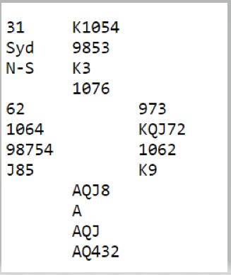 Med øst giver og alle i faresonen var starten 1 hj—1 sp og gjenmelding 2 spar fra Vest nok for de fleste til å starte slem- forsøk via Blackwood. De fleste landet i 6 spar av Øst men hvordan spille trumfen? PåmFBK3 kom Tone Annette Olsen bare i 4 spar og da er presset enklere. Huntol sp 3btilmlitenogm10-erenfra hånden. Da Sydnlamlitenog begge fulgte måsp A ble det bare en taper, men de fleste hadde spilt sp A fulgt av ny trumf til D og fikk to tapere i trumf da N hadde sp KJx