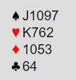 Gode fordelinger med solid trumftilpasning gjorde at begge sider presset på ut over det poengstyrke skulle tilsimen sonene var jo gunstige. Ru D kom ut fra Jens Henrik og da den beholt stikker spilte han kl 5 i 2. stikk og den måtte jeg jo bare stikke med knekten som fikk beholde stikket. Sp 5 til knekten stakk Vest og spilte ru 3 til kongen fra Per Even, men jeg kunne stjele, ta for sp J der Vest sakte ruter og på sp 3 til damen ble nok en ruter saket fra Vest. Hvordan spille videre, er det hjerter- eller kløver- fargen man kan håpe på jevn sits i?. Begge fargene kan jo sitte 3-3 imot. Valgte begge, trumf hjem og kløver til damen fulgt av kl A men da viste Øst utsolgt og sakte ruter. OK, vi kjører bare på med hj A, så hj 7 til liten og knekten som fikk beholde stikker. På hj K fulgte både Øst med kongen og Vest med 10-eren. Dermed var de to små hjerterne godspilte bare ved ta dem og 11 stikk var vunnet for ren topp. Og det holt til 2 poeng seier forran Astrid og Hans. De var ikke like heldige på slutten.