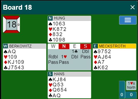 1 hjerter doblet ble ingen hyggelig kontrakt å spille for Andy Hung. Ø/V fikk til en slags krysstjeling i spar og ruter, og det endte med tre doblede bet, Ø/V + 800.