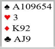 19nhp men kunn4 mulige tapere er nok for kravåpning 2 kløver, men her valgte makker å åpne mer beskjedent, 1 spar!. Selv hadde jeg etter åpning 1 spar fra Tone sterke nok kort for å bruke krav- Stenberg, men ville høre makkers gjenmelding før kontrakt nivå ble bestemt.