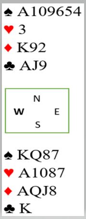 3 kløver viste god åpning, 3 hjerter kontroll og 4 kløver også kontroll-alt 1 eller 2. Da jeg over 4 kløver bare meldte 4 spar benektet jeg kontroller i ruter og 2.kontroll i hjerter, men Tone Annette hadde hjempe fordeling og sto på med 5-ess Blackwood-søk der jeg kunne vise 2 ess! Da lå 7spar-budet klart! Ruter ut og claim ettet uttrumfing. Bare Holmen-Kjærstad fant i tillegg at storeslem skulle meldes,