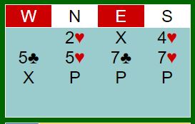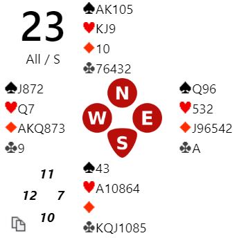 Merk at 7 kløver står da det er avkast for spar på ruterfargen. Merk også at N/S kan vinne tolv stikk i sparkontrakt om det tippes riktig på hvor spar knekt er plassert. I dette spillet står det altså storeslem Ø/V og lilleslem N/S (med heldig sparvalg)!