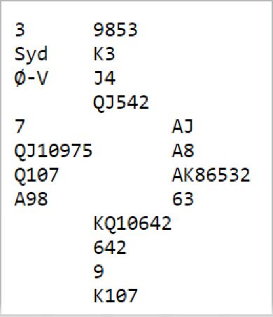 Som du ser sitter det brillefint med hjerter konge dobbel i saks, så uansett om kontrakten blir 6 hjerter eller 6 ruter, og uansett utspill fyker slem hjem. Dessuten har syd et ganske naturlig utspill, spar konge. Da har spillefører råd til en hjertertaper i slem. Som vi også kan se blir det ikke slik at man får melde i fred her, for syd er giver og N/S er i gunstig sone. Syd vil åpne med svake 2 spar (eller Multi 2R), eller noen steder med 3 spar. Da er det sannelig ikke lett. Har vest til 3 hjerter over åpning med 2 spar fra syd? Vest har egentlig ikke nok HP, men det er en tett og fin sekskorts farge. Nord vil uansett være med på "festen" i disse gunstige soneforholdene for N/S. Det er normalt å si 4 spar med slike kort, firekorts spartilpasning til syds sekskortsfarge. Det er selvsagt en stamp, og for å ta bort melderom for Ø/V som sett fra nords synspunkt ganske sikkert har den høyeste kontrakten og minst utgang i kortene. Da blir det veldig mye gjetting for Ø/V.