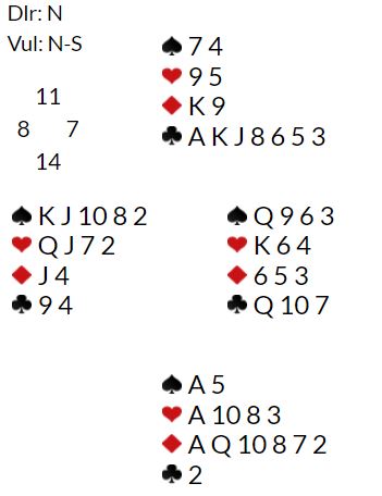 Det starter vel med 1 kløver fra nord som er giver, og syd melder ruter. Nå har ikke nord helt til å hoppe til 3 kløver da det viser flere HP, men med meget god syvkorts farge behøves ikke nødvendigvis de foreskrevne ca. 16-17 poengene for den meldingen. 13-14 gode poeng med en meget god syvkortsfarge bør holde til et hopp. Men her er det kun 11 poeng, så å melde 3 kløver andre gangen vel i overkant. Og om nord melder 2 kløver som vel er normalt å gjøre, og så 3 kløver idet syd for eksempel melder 2 hjerter vil syd på ingen måte syd tenke alvorlig på at 6 kløver er riktig. Det er med andre ord ikke lett å finne toppkontrakten 6 kløver her.