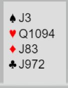 Du sitter syd og hører 1 ruter fra makker, og over ditt svar 1 hjerter sier makker 1NT som viser 12 (11) -14 balanserte. Hva melder du? Kan det stå slem?
