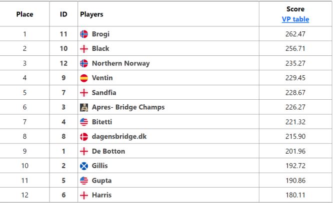 Vi har allerede fortalt at Bergen Akademiske 1 (C.Bakke) gikk videre til finalen i NM for klubblag etter en marginal seier (1 IMP) mot TopBridge 5. Forleden fikk klubben med nok et lag til lagfinalen da Bergen Ak 2 med Svein-Olai og Jim Høyland, Tor Bakke og Magne Eide vant storkampen i 6.runde mot sterke Sunndalsøra BK.
