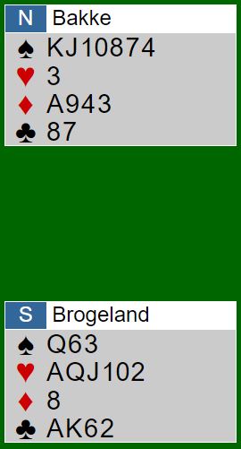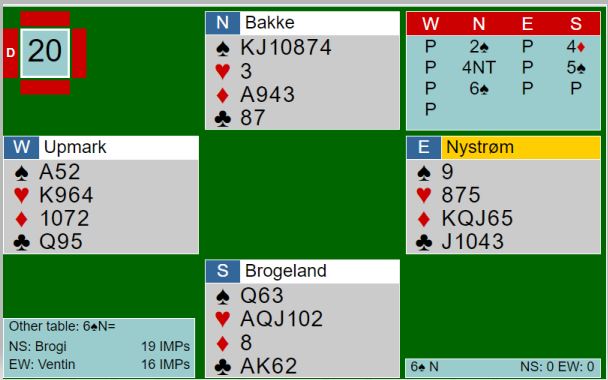 Ved det andre bordet åpnet nord med 2 spar, spar og en minor og under åpningsstyrke. Øst for Bergen Ak doblet, og vest krevde med 3 spar. Da gikk øst på til slem og foreslo etter hvert 6 ruter. Øst korrigerte naturlig nok og foreslo 6 hjerter før øst avsluttet med 6NT. Hvordan bør den kotnrakten spilles etter spar knekt i utspill fra syd?