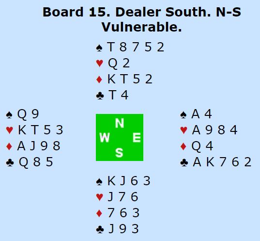 Om man skal være helt ærlig er 7 ruter litt vel hardt, men storslemmen har bra sjanser! Og å se at vests kort mot en 1NT åpning er slemkort er bra vurdert.