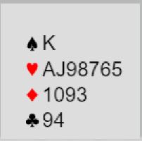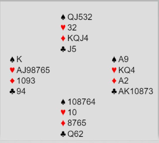 Forklaring: vi bruker overføringssvar på 1 kløver, og det var borte for meg et øyeblikk. Jeg hadde altså ikke vist firekorts hjerter, men firekorts spar og renons i hjerter!