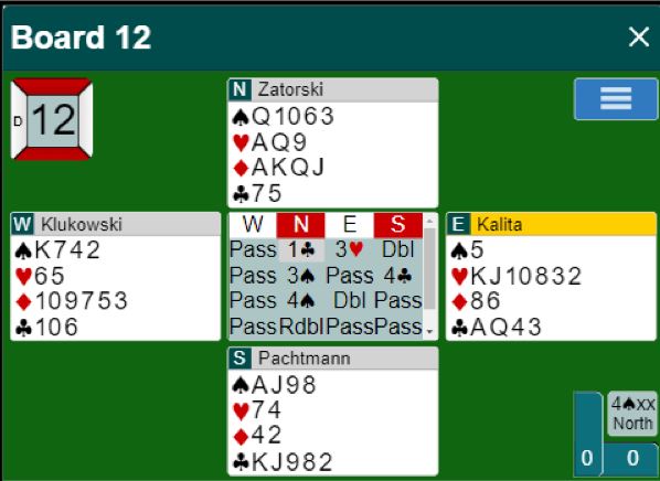 I 5 hjerter er det minst to doblede bet, men da røyken hadde lagt seg var spillefører gått fire doblede, N/S +1100. Spillet ga 15 IMP til STREET, størstedelen av ledelsen deres halvveis i kampen.