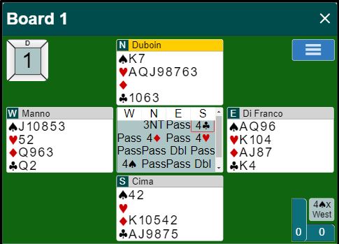 Der Duboin åpnet med 4 spar passet Pachtmann (Street) med østs kort, og det gikk pass rundt.