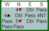 Ved det andre bordet meldte en spiller ved navn Ward-Platt inn 5 hjerter, voldsomt spør du meg. Syd doblet 5 hjerter, og det gikk pass rundt. Slik så hele spillet ut: