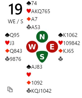 Herland-Skimmeland spiller med «kløverføringer». Så nords 1 ruter viste hjerterfarge, og syds 1 hjerter viste slik de spiller tre eller fire hjertere. Skimmeland ble optimistisk da syd var med til 3 hjerter selv om han vet syd har 11-13 balanserte, og han løftet til en hardmeldt utgang.