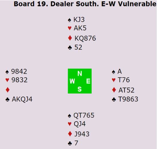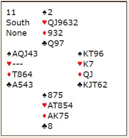 Ved det andre bordet meldte nord 2 kløver i balanseringsposisjonen. Helge Homme (øst) meldte 2 hjerter før N/S endte i 3 kløver som de vant akkurat til tross for den stygge trumfsitsen. Med -110 ved det bordet og +800 fra lagkameratene ga spillet 12 IMP til Norge.