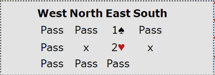 Øst burde kanskje sagt 2 hjerter over nords dobling. Ikke så mye fordi det kan gå pass rundt på 1 spar, men fordi han har en fin hånd og Ø/V kan ha en bra hjerterkontrakt.