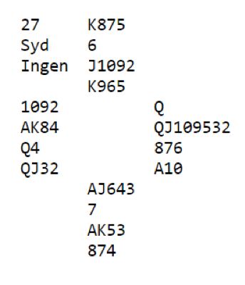 Det er ikke så ofte man vurderer trumfutspill fra knekten dobbel, men i dette tilfellet er det trumfutspill som gjelder samme hva syd har. Han må beskytte sparstikkene sine så ikke spillefører kan få trumfet spar hos vest.