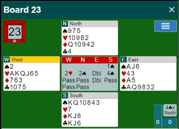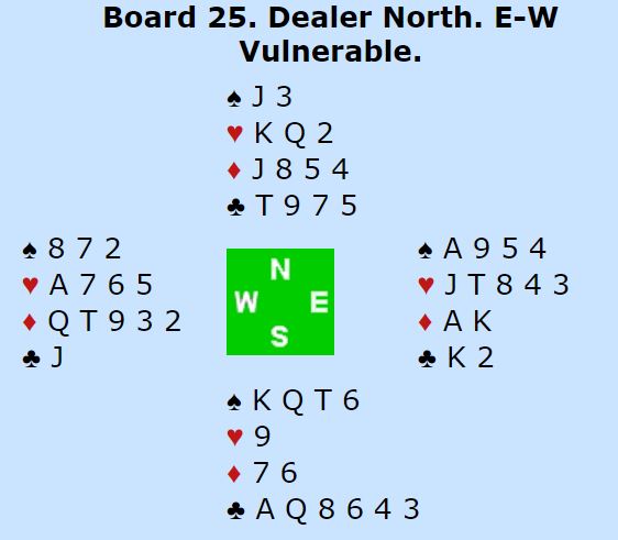 For to av parene som kom seg i 6 ruter var vest spillefører. Da blir det bet med hjerter ut. Men begge unngikk det og hadde sjansen, men gikk bet. Jeg vet dog ikke hvordan meldingene hadde gått ved de to bordene.