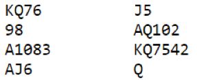 Kløverfinessen kan (hvis syd har åpnet) trygt tas, det er neppe slik at syd har åpnet med ca. 8 poeng. Men ett ekstra kløverstikk gir kun ett avkast. Nå er det imidlertid en ypperlig sjanse hvis man kjenner igjen varianten, spar 5 fra øst! Syd kan ingenting gjøre. Tar han for spar ess blir det tre sparstikk, og med spar knekt godspilt gir K-Q to avkast for to hjertere fra øst. Ett ekstra kløverstikk gir avkast for en tredje hjerter, og spillefører taper kun til spar ess. Om syd legger liten på spar 5 vinner spar konge stikket, men da kastes spar knekt på det ekstra kløverstikket. I så fall tapes kun ett hjerterstikk, +920.