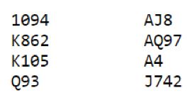 I 4 hjerter må det en god del til. Sparfargen må gi kun en taper, og kløveren må løses med kun to tapere som normalt avhenger av kløver 10 i saks, dvs. hos syd. Dessuten må det ikke sitte slik at de kan ta to kløverstikk og kløver til stjeling (4-2 i kløver) med det samme, da blir det autobet. I tillegg til dette må trumfen sitte slik at det ikke blir taper i den fargen. Med andre ord er ikke 4 hjerter noen veldig god utgang.
