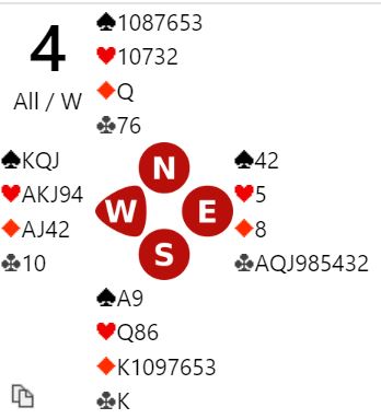 Der ruter dame kom i utspill ble kløver ess spilt med tanke om å prøve den andre sjansen om ikke kongen kom på. Siden kongen falt var det over, tolv stikk, DE BOTTON +1370.Spillet var verd 16 IMP for DE BOTTON.