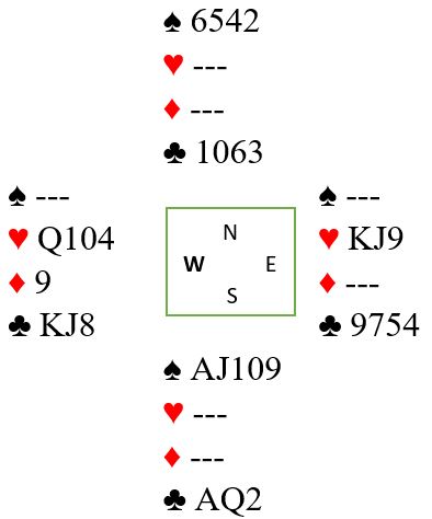 Trumfen ble tatt ut, og før det ble hjerter ess innkassert. Inne på bordet på trumfdamen ble den andre hjerteren spilt og trumfet på hånden. Så ble de to siste ruterstikkene innkassert, og dette var igjen: