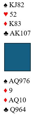 Opptelling: Det er fem toppstikk i de svarte fargene. Både hjerter og ruter kan gi fire stikk, men det kan også bli kun tre stikk i begge de fargene. Med minmum uttelling i de røde fargene blir det 2+3+3+3=11 stikk, en bet.