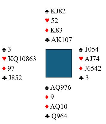 Det var et hjertervalg fra start, og en stund så det ut som syd neppe kunne ha hjerterlengde. Siden du «giddet» å sjekke om det kom noen god informasjon fikk du vite at nå er det ikke noe valg i hjerter likevel. Du spiller hjerter konge, hjerter til esset og hjerter til tiren uten å bekymre deg i det hele tatt hva nord legger, for en hjerter til (knekten) har han ikke!
