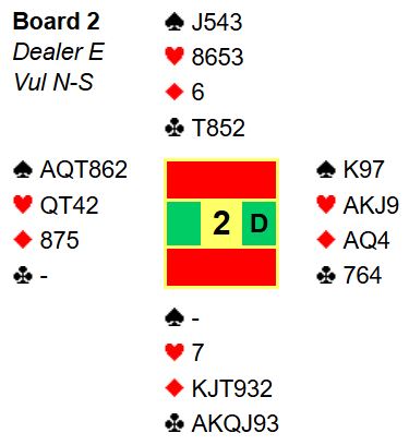 Å vinne alle stikkene i hjerterkontrakt ville vært ganske greit om hjerteren hadde vært fordelt 3-2. Da er det relativt enkelt, seks sparstikk, to kløverstjelinger hos øst og dermed seks trumfstikk + ruter ess = 13. Men her sitter trumfen 4-1. Det går likevel bra med en "åpne kort spilleføring". La oss si det kommer kløver ut til stjeling. Det spilles trumf til øst, og nok en kløverstjeling tas. Så må det spilles helt med åpne kort som computeren gjør siden sparen sitter 4-0. Det tas en trumfrunde fra vest, så må det spilles spar til nieren mens det er igjen trumf. Hvis ikke det gjøres blir det blokkering i spar siden det ikke lenger er inntakt til vest. Den utrolig sparfinessen holder, og den som er renons i spar hadde bare singel trumf!