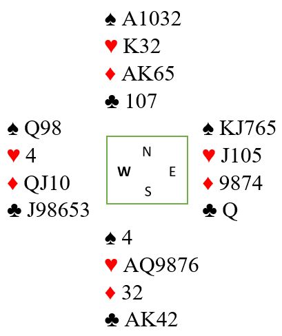 Et annet lite poeng er hjerterfargen om en ser isolert på den. For å spille en sånn farge best mulig for å unngå taper bør normalt kongen spilles først. Sitter det 3-1 eller 2-2 er det uinteressant med hensyn til antall stikk i fargen, det blir alltid seks stikk med en sånn farge da. Men det kan sitte 4-0. Den eneste 4-0 sitsen en kan takle med denne hjerteren er alle fire hos øst. Kongen avslører i så fall sitsen, og en dobbelfinesse over J-10 fjerde kan tas med A-Q-9 hos syd bak den med alle fire uteværende hjertere. Men det er som sagt teknikk og fargen isolert sett. I dette spillet må det trumfes kløver(e) hos nord og da faller det med fargebehandling for å takle 4-0 sits bort i dette tilfellet.