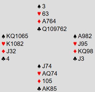 I dag får du et spill jeg leste om i et gammelt bridgemagasin for en stund siden. Siden jeg ikke kunne finne igjen det bladet er kort-diagrammet konstruert etter beste evne, og om ikke alle kortene er helt korrekte er i alle fall spillets poeng korrekt.