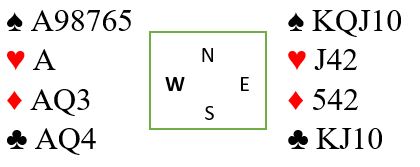 Men vi tenker oss at syd i innspill-situasjonen kommer på med damen eller kongen i hjerter over østs knekt. Da trumfes hos vest og spillefører må tippe litt. Om syd har ruter konge har han den hele tiden, og vi kommer til å vinne denne slemmen uansett. Men nå kan en spille på en av to sitser som gir kontrakt selv om nord har ruter konge. Du kan satse på at det så omtrent slik ut fra start: