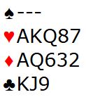 Så du legger liten hjerter fra begge hender i første stikk, kommer inn i tredje stikk etter hjerter ess og en til fra vest. Da spilles spar til knekten og østs konge. Derfra kommer kløver til esset. Så spar til nord og ruter opp mot syds honnører. Øst legger vel liten ruter, og damen vinner det stikket. De tre kløverstikkene tas og en spar forsvinner fra syd. Så mer ruter mot syd. Det vinnes i alt to sparstikk, ett hjerterstikk, to ruterstikk og fire kløverstikk = 9.