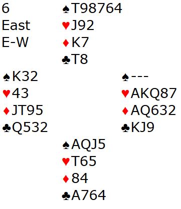 Løsningen er å sørge for at vest ikke får være med i det hele tatt videre i dette spillet. I første stikk legges liten hjerter fra begge hender! Vest fortsetter vel med hjerter ess og mer hjerter, og ja, det ville gått galt om vest satt med ruter ess. Men om han hadde hatt det kortet måtte du uansett innom spar konge og ville altså gått bet om du brukte hjerter dame i stikk en.